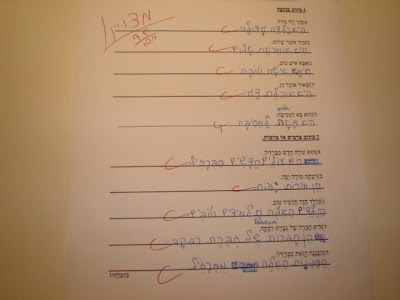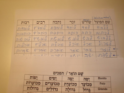 (O que vêem na imagem em cima, mais concretamente na segunda coluna a contar da direita, é o mais importante na língua hebraica: a raíz dos verbos, que nos permite reconhecer uma série de palavras cujo significado ignoramos. É uma espécie de chave. Um dia falo sobre isto. Agora já é tarde e amanhã tenho de acordar assim.)